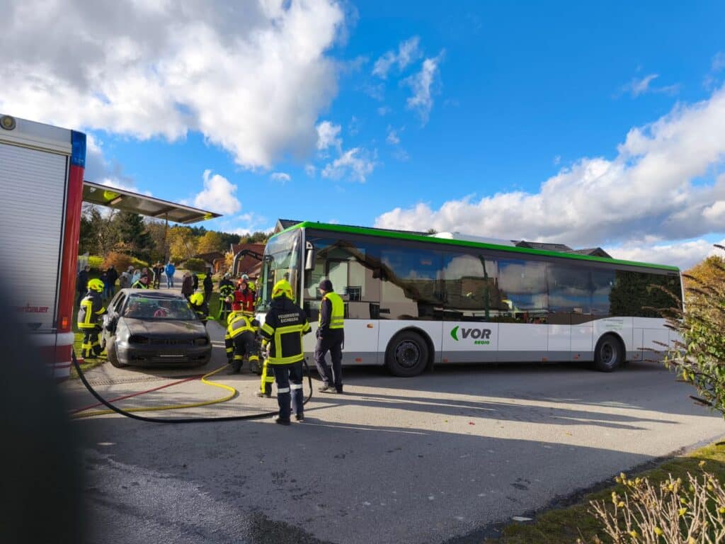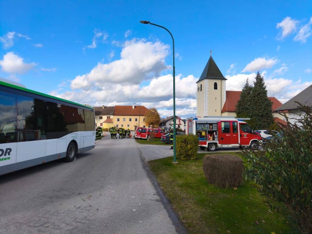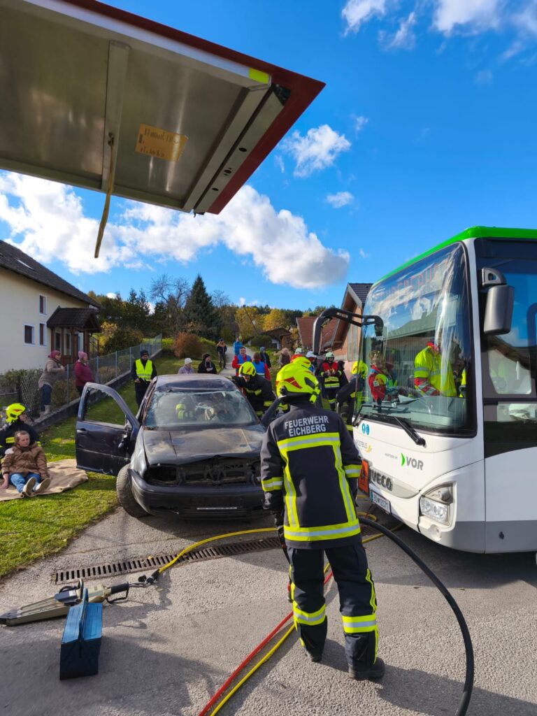 Übungsannahme war der Zusammenstoß eines Linienbusses mit einem PKW. Im PKW befanden 2 Personen, wobei eine Person eingeklemmt war und mittels hydraulischem Rettungssatz schnell befreit werden musste. Die 2. Person konnte durch die Beifahrertür befreit und bis zum Eintreffen des Roten Kreuzes betreut werden.