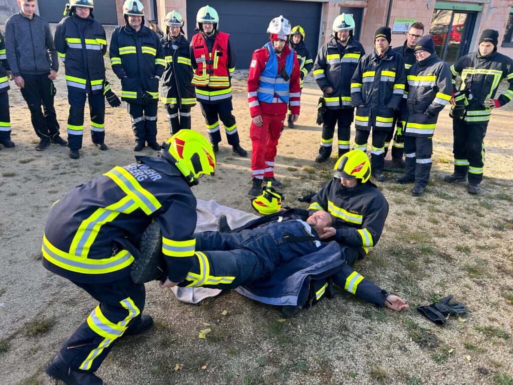 Im Anschluss wurde noch vorgeführt wie im Einsatzfall vorgegangen werden muss wenn ein Atemschutzträger kollabiert / verletzt wird um ihn im Anschluss an die Rettung zu übergeben. Hierzu muss dieser von 2 Mann sicher von seiner Ausrüstung befreit werden.